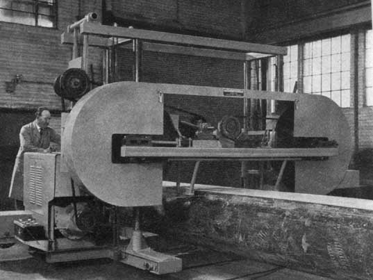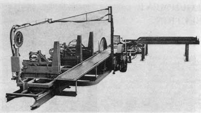 Scie a ruban forestor. - Avec la scie Forestor, la grume ne se déplace plus pendant le sciage; c'est le dispositif de sciage tout entier, avec son moteur, qui se déplace sur des rails entre lesquels est fixée la grume. La scie Forestor n'a pas besoin de fondation et peut Scier des grumes de 180 cm de diamètre.