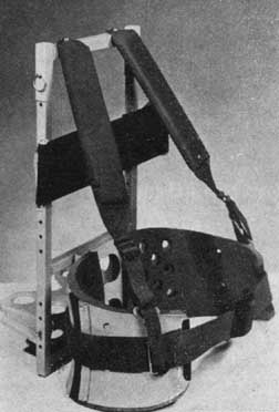 Harnais Bell. - Le modèle standard a un cadre en aluminium tubulaire auquel est accrochée la charge. Il comprend un support pliable et ajustable sur lequel on peut appuyer la charge le cas échéant. Le cadre est fixé à une ceinture d'aluminium profilé doublée à l'intérieur d'un rembourrage aéré imperméable. Le harnais est conçu de telle sorte qu'il peut être facilement modifié ou équipé d'accessoires spéciaux permettant de transporter des objets de pratiquement n'importe quelle dimension ou forme. Poids approximatif 1,8 kg.