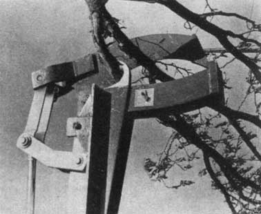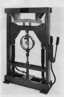 Machine Newsum pour les essais de résistance. - La machine Newsum PR.3T est spécialement conçue pour permettre un contrôle facile de la qualité des joints collés (résistance à la flexion et au cisaillement). La pièce à essayer est fixée entre deux guides et l'effort de flexion est effectué à l'aide d'un bélier hydraulique. L'anneau est prévu pour une pression de 3 t au maximum; il est monté sur des pivots à roulement pour assurer une liberté totale. Le bélier hydraulique peut se déplacer sur 120 cm; il est contrôlé par une pompe à un seul piston manuvrée à la main. Hauteur totale 116 cm, largeur totale 81 cm. L'illustration montre un échantillon de pointage en bout au point de rupture sous une contrainte de flexion.