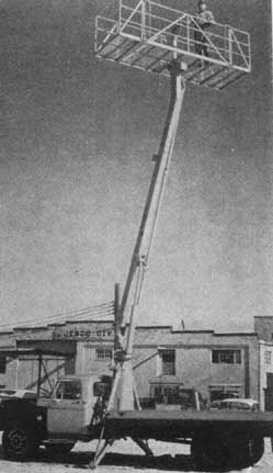 Plate forme élévatrice. - Cette plate-forme élévatrice qui peut porter des ouvriers est montée sur un camion. Elle mesure 120 X 365 cm et peut lever 3 630 kg. La flèche de 670 cm pivote sur 370°. En position de route la plate-forme, en pivotant, n'a plus qu'un encombrement de 120 X 240 cm. La manuvre peut être assurée depuis la plate-forme même.