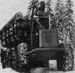Autochargeur. - Le Valmet Terra 865 LM a un chargeur hydraulique monté sur le toit de la cabine et manuvré depuis la cabine. Longueur de la flèche 4,6 m; capacité de levage 3 000 kg; rotation de la flèche 380°; rotation de la pince preneuse 280°; longueur maximale du chargeur 120 cm; largeur maximale 220 cm; garde au sol 66 cm; poids du véhicule 7 300 kg; capacité 8 000 kg. Le chargeur est actionné par un moteur diesel à 4 cylindres qui développe 82 oh SAE à 2 100 tr/mn.