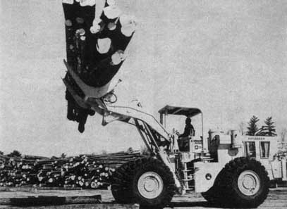 Chargeur articulé Payloader. - Le chargeur articulé H-120C est actionné par un moteur diesel à 6 cylindres International DT-817 d'une puissance au volant de 296 ch à 2 100 tr/mn. Le chargeur Payloader peut déplacer en une fois 14,5 m³ de grumes du camion sur la pile ou de la pile sur la plate-forme de sciage. Il a 4 vitesses AV et 4 vitesses AR, et peut atteindre 48 km/h en marche AV.