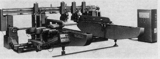 Machine à mettre à dimension et à profiler double 102" WFN 2500.- Cette machine convient particulièrement à l'usinage complet de nombreux éléments en panneaux ou en bois plein prêts à être assemblés pour la fabrication de mobilier. Livrée en trois dimensions avec un écartement maximal de l'entraînement à chaîne de 150, 250 et 400 cm. Peut être équipée d'accessoires pour rainurer, percer, profiler, biseauter, arrondir les angles, etc.