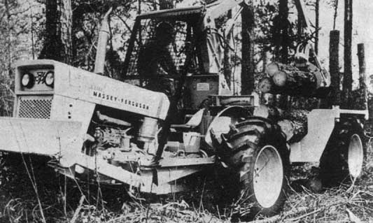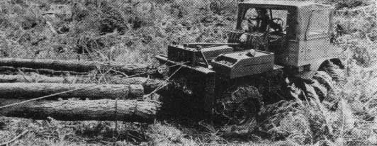 Treewer. - Cette machine permet à un seul homme de récolter, charger, débarder, décharger et empiler 75 à 100 m³ de bois rond par jour. Une articulation centrale permet d'obtenir une indépendance des quatre roues (sur 86 cm) et la direction articulée donne un très court rayon de braquage; quatre roues motrices et une bonne distribution du poids permettent une traction constante. La flèche pivote sur 270°. La pince de 0,5 m³ peut lever plusieurs rondins à la fois.