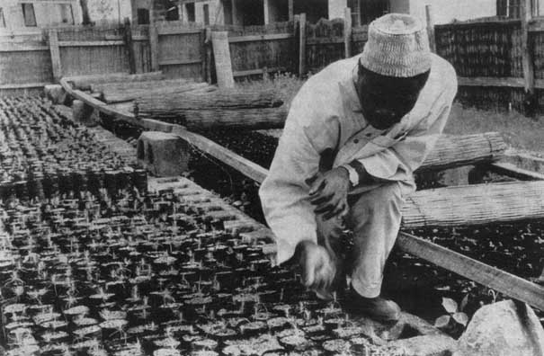 FIGURE 3. - Inoculation des plants en tubes de polythène. Pépinière de Bukuru, Nigeria.