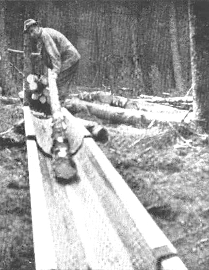 Construído bajo la dirección de la Comisión de Silvicultura, de peso ligero. Se efectuaron ensayos en un punto inaccesible con 275 m. (300 verdea) de deslizadero, en una pendiente con inclinación media de 18°. Por medio de unos 90 m. (100 yardas) de deslizadero de madera con inclinación de 28°, situado en la parte superior del de aluminio, se hacían llegar las trozas a este último. Para amontonar la madera a la cabeza del deslizadero se utilizó fuerza animal. Cuando el deslizadero de aluminio estaba seco, la inclinación de 18° no era del todo suficiente para mantener las trozas en movimiento, pero con un poco de agua el deslizamiento era satisfactorio. Características: está formado por secciones de 2,4 m. (8') de longitud, en que se utilizan planchas de 2,4 x 0,8 m. (8' x 2' 6"), calibre 914; poso de cada sección, 10,9 Kg. (24 libras). Las distintas secciones se unen entre sí por medio de espigas y resaques, de modo que no es preciso transportar ninguna pieza suelta.