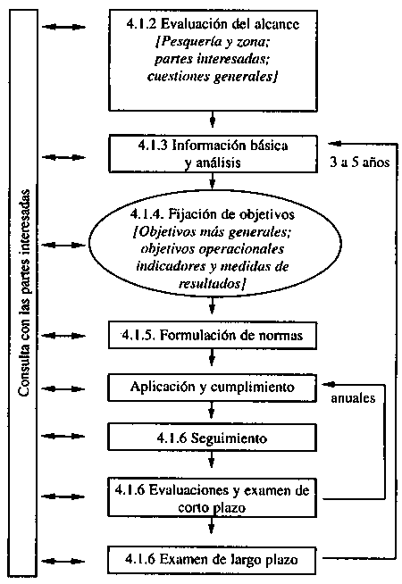 Fuente: Adaptado de: Departamento de Pesca de la FAO, La Ordenación Pesquera, Orientaciones Técnicas para la Pesca Responsable N° 4, Roma, 1997. Los nuevos elementos se han escrito en letra cursiva. |