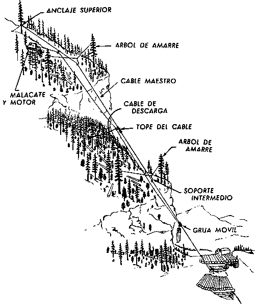 Ejemplo elocuente de método de extracción ineficaz lo constituye la utilización de animales de tiro para acarrear madera por pendientes accidentadas Para el acarreo de cada una de las pequeñas cargas es necesario llevar a cabo una subida fatigosa y lenta y un descenso difícil, cuando el hecho es que este trabajo sólo exige el transporte en una dirección, cuesta abajo, lo cual puede conseguirse por la fuerza de la gravedad. Como quiera que, los lanzaderas, cablevías y otros dispositivos análogos sólo se justifican económicamente en operaciones concentradas, el Instituto Canadiense de Investigaciones sobre Pasta y Papel ha realizado en los últimos años estudios sobre las posibilidades de desarrollo de un método sencillo y barato para el transporte de madera por pendientes excesivamente pronunciadas aprovechando su propio peso sobre fuertes cables aéreos de un sólo cabo de acero, con resultado satisfactorio.
