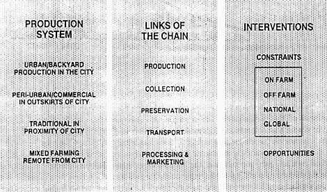 Future interventions would have to encourage a systematic approach to ensure farmers produce what will satisfy market demand. This includes consideration of transporting fresh produce from-rural to urban markets to be delivered at a price and in a condition that is acceptable, accessible and affordable by urban consumers - with low and high incomes. It is important to integrate effectively production systems and the farmers with the industrial system that embody collection, preservation, processing, marketing and distribution together with the diversity of supplying services. Higher productivity in the primary production must be complemented and sustained by logistically and technologically efficient systems throughout the chain from farmer to consumer.