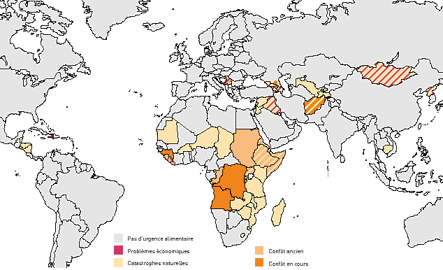 La majeure partie du phénomène de la faim dans un monde d'abondance est le résultat d'une pauvreté accablante et profondément enracinée. Cependant, année après année, entre 5 et 10 pour cent de ce phénomène peuvent être rattachés à des événements spécifiques: sécheresses ou inondations, conflits armés ou perturbations politiques, sociales et économiques. Bien souvent, ces ondes de choc frappent des pays qui souffrent déjà de pauvreté endémique et qui luttent pour se relever de catastrophes précédentes, naturelles ou provoquées par l'homme. L'an dernier n'a pas fait exception à la règle.