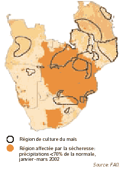 L'Afrique australe se trouve aujourd'hui confrontée à la crise alimentaire la plus grave depuis la sécheresse dévastatrice de 1992. Près de 13 millions d'habitants de la sous-région ont aujourd'hui besoin d'une aide alimentaire d'urgence, après une succession combinée de sécheresses, d'inondations et de perturbations économiques, qui ont réduit les récoltes de plusieurs pays à la moitié, voire moins, de leur volume normal. Le pays le plus touché a été le Zimbabwe, où environ 6 millions de personnes ont besoin d'une aide alimentaire d'urgence. Jusqu'à récemment, le Zimbabwe était exportateur de maïs. Cependant, au cours des deux dernières années, la conjonction de mauvais temps, de conflits politiques et de problèmes économiques a amputé la production et les importations. Les conflits à propos de la redistribution des terres ont entraîné une grave réduction des emblavures de cultures commerciales. La production de maïs s'est effondrée, pour ne représenter que le quart du volume obtenu il y a à peine deux ans. Le pays se trouve confronté à un déficit sans précédent, soit plus de 70 pour cent de ses besoins céréaliers, au moment où la crise économique ne lui laisse que peu de devises étrangères pour l'importation de produits alimentaires