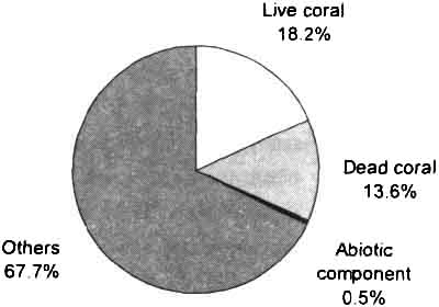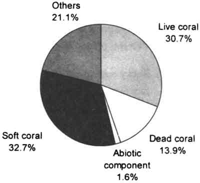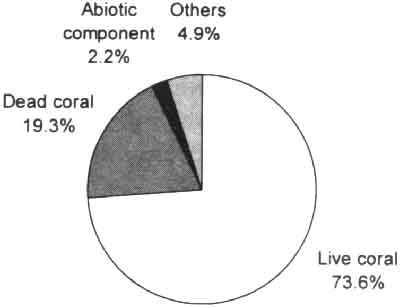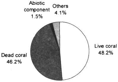 The reef flat consists predominantly of isolated patches of stunted Porites spp. boulders, interspersed by a sandy bottom. The reef flat gradually slopes down to a narrow fore reef which continues at a steeper gradient to a sandy sea bottom. Massive corals such as Porites spp. and branching staghorn corals (Acropora spp.) form the bulk of the fore reef and reef slope areas. |