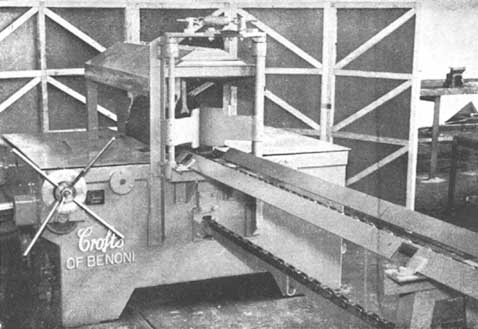 Particulièrement utile pour travailler de grandes pièces de bois. Une pièce de 12 in. (30 cm) d'équarrissage par 10 ft. (3 m) de long, peut être travaillée par un seul homme. L'angle de coupe peut être progressivement modifié au cours du sciage. On peut réaliser un angle de 0 à 45 degrés à gauche et de 5 degrés à droite. Echelle graduée et aiguille indiquent exactement l'angle. L'inclinaison est commandée par une manivelle placée sur le côté gauche de la table qui est fixe, et toutes les autres parties de la machine s'ajustent automatiquement à l'angle choisi.
