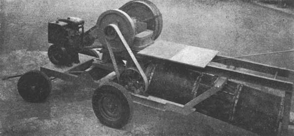 Disponible avec moteur à pétrole ou diesel. Mâchoire des concasseurs de différentes dimensions pour des productions de 5 à 15 tonnes de pierre concassée à l'heure; un tambour-calibreur de 30 in. (76 cm) de diamétre sépare les pierres on 3 ou 4 catégories et met à part les gros éléments. Monté sur wagonnet fabriqué on tubes d'acier laminé et normalement équipé de roues à pneus. Une direction de type Ackermann, ajustée à la barre de remorque sur l'essieu avant, rend les manuvres plus sûres sur les sols en pente. Des dispositifs de protection existent sur toutes les courroies de transmission et les volants; une plate-forme de chargement est juxtaposée à la trémie de chargement du concasseur. L'installation est de construction robuste et conçue pour un travail dur et continu.