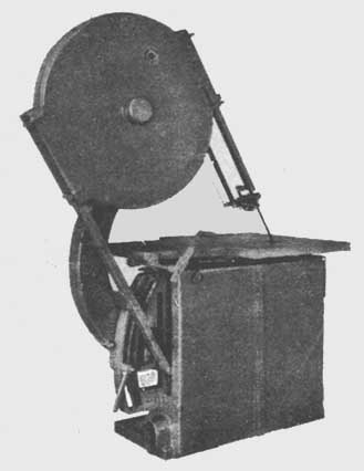 Nouvelle scie à lambris destinée aux industries travaillant des matériaux en feuilles et utilisant la matière plastique (par ex. Formica), le contre-plaqué et les panneaux de fibres. La soie et son action sont contrôlées en même temps que la fixation du matériau. La feuille est solidement maintenue sur la table de part, et d'autre du trait de soie par la pression d'un balancier agissant de haut en bas. La soie ne traverse le matériau qu'à l'aller, le mouvement de retour se fait complètement sous la table, facilitant l'enlèvement immédiat du matériau. Dimensions principales: Longueur maximum de coupe: 10 ft. (3 048 mm); épaisseur maximum de coupe: 1 in. (25 mm); diamètre de la scie 10 in. (254 mm), moteur d'entraînement: 1 ½ CV; poids net: 1 120 lb. (508 kg).