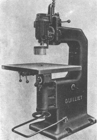 A l'aide de gabarits, cette machine réalise en série des jouets, des écrins, des pièces d'ébénisterie, etc. Un convertisseur transforme la fréquence de 50 périodes/sec. à 300 ou 400 périodes/sec. pour obtenir 18 000 ou 24 000 tr/min. Le porte-outils peut s'incliner de part et d'autre de la verticale jusqu'à 45o. Cette inclinaison est indiquée par une échelle graduée. Course du porte-outils: 130 mm. Guide reproducteur escamotable commandé par levier.