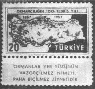 TURQUIE: Pour commémorer le centenaire de l'enseignement forestier en Turquie, une série spéciale de quatre timbres a été émise en novembre 1957 par le Ministère des communications en collaboration avec le Ministère de l'agriculture. 500 000 séries seulement ont été imprimées et mises en circulation dans les deux dessins ci-contre:
