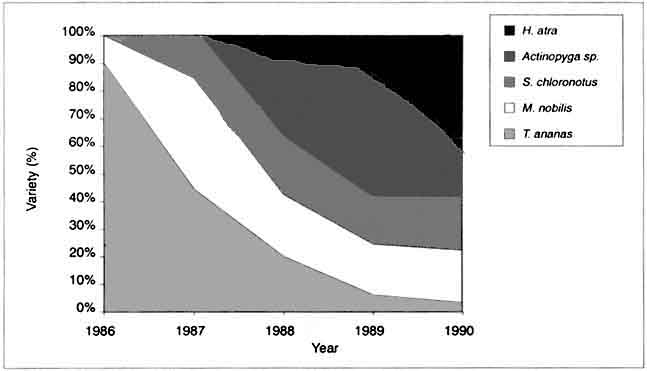 As the fishery evolved, the species composition of the exports also changed (Fig 2.3.) Initially only the high value species like Thelenota ananas (prickly red fish) and Microthele nobilis (white teat fish) were exported. However five years later, by 1990, catch composition had completely changed, with exports being dominated by the low-valued Halodeima atra (lolly fish). It is suggested that the level of exploitation of this species clearly reflects the state of the sea cucumber fisheries in the various islands. It is believed that fishermen tend to leave this species without exploitation as long as other species are available (Joseph, 1992).