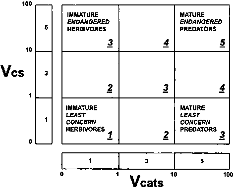 Figure 2: Conservation Status index Vcs combined with index for conventional herbivore/planktivore-omnivore-predator food chains Vcats which incorporates age structure in each trophic level. The text in each box of the matrix describes the biomass which most influences the value of the index. The terms 'least concern' and 'endangered' refer to Red List conservation status (IUCN 1994).
