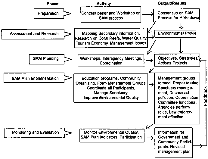 The ongoing process for the Hikkaduwa town and marine sanctuary focuses on the collaboration of the local communities and government with national government agencies in the formulation of a management plan for the area. The plan includes short-term implementation projects deemed desirable by all participants. The process mediates amongst the competing users and builds a consensus on what use(s) can be harmonious and in accordance with national policies for coastal management. Steps in the process of the ongoing SAM planning in Hikkaduwa are shown in Figure 3 and include: