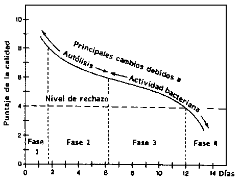 Cuando se requiere un criterio de calidad durante el almacenamiento del pescado refrigerado, se puede llevar a cabo una evaluación sensorial del pescado cocido. Algunos de los atributos para el pescado y los mariscos cocidos, se mencionan en el Cuadro 5.2. Se puede detectar un patrón característico del deterioro del pescado almacenado en hielo, el cual puede ser dividido en las cuatro fases siguientes: