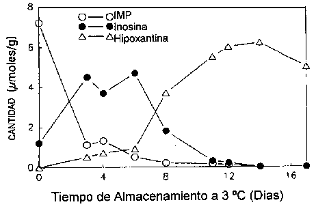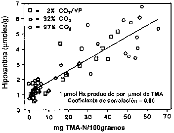 En muchas especies de pescado el desarrollo de la TMA es paralelo a la producción de hipoxantina. La hipoxantina, según lo descrito en la Sección 5.2, puede ser formada por la descomposición autolítica de nucleótidos, pero también puede ser formada por bacterias; la tasa de formación por la acción bacteriana es mayor que por autólisis. Tanto Jorgensen et al. (1988) como Dalgaard (1993) demostraron una correlación linear entre el contenido de TMA e hipoxantina durante el almacenamiento en hielo de bacalao empacado (Figura 5.14). Algunas de las bacterias del deterioro producen hipoxantina a partir de inosina o inosina monofosfato, incluyendo Pseudomonas spp. (Surette et al., 1988), S. putrefaciens (van Spreekens, 1977; Jorgensen y Huss, 1989; Gram, 1989) y P. phosphoreum (van Spreekens, 1977).