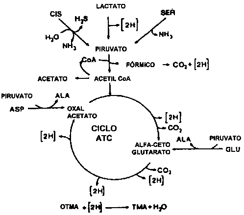 Ringo et al. (1984) han demostrado que la cisteína es utilizada como sustrato en el ciclo de Krebs cuando los electrones son transferidos al OTMA, de este modo la formación de H2S y TMA son hasta cierto punto reacciones vinculadas (Figura 5.12).