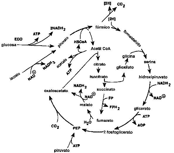 La reducción del OTMA está generalmente asociada con géneros de bacterias típicos del ambiente marino (Alteromonas, Photobacterium, Vibrio y S. putrefaciens), pero también es llevada a cabo por Aeromonas y bacterias intestinales de las Enterobacteriáceas. La reducción del OTMA ha sido estudiada en bacterias fermentativas, anaerobias facultativas, como E. coli (Sakaguchi et al., 1980) y Proteus spp. (Stenberg et al., 1982) como también en la bacteria no fermentativa S. putrefaciens (Easter et al., 1983; Ringo et al., 1984). Durante el crecimiento aeróbico, S. putrefaciens emplea el ciclo de Krebs para producir los electrones que posteriormente son canalizados a través de la cadena respiratoria. Ringo et al. (1984) proponen que durante la respiración anaeróbica S. putrefaciens también utiliza todo el ciclo de Krebs (Figura 5.12), mientras recientemente se ha demostrado que en la respiración anaeróbica de S. putrefaciens, sólo utiliza una parte del ciclo de Krebs (Figura 5.13) y los electrones son generados también por otra ruta metabólica, denominada la ruta de la serina (Scott y Nealson, 1994). S. putrefaciens puede emplear una variedad de fuentes de carbono como sustrato en su respiración anaeróbica dependiente de OTMA, incluyendo formato y lactato. Compuestos como acetato y succinato empleados en la respiración del oxígeno no pueden ser empleados cuando el OTMA es el aceptor terminal de electrones (DiChristina y DeLong, 1994), por el contrario, el acetato es uno de. los productos del la reducción anaeróbica del OTMA (Ringo et al., 1984; Scott y Nealson, 1994).