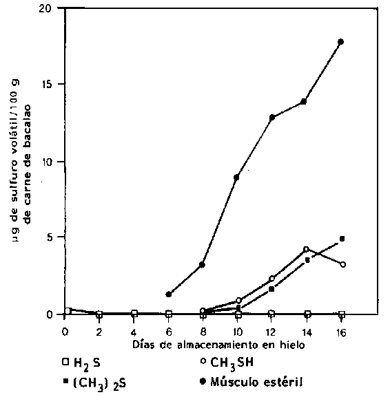 Los compuestos sulfurados volátiles son componentes típicos del pescado deteriorado y la mayoría de las bacterias identificadas como bacterias específicas del deterioro producen uno o algunos sulfuros volátiles. S putrefaciens y algunas Vibrionaceae producen H2S a partir del aminoácido sulfurado 1-cisteína (Stenstroem y Molin, 1990; Gram et al., 1987). Por el contrario, ni Pseudomonas o P. phosphoreum producen cantidades significativas de H2S. De esta forma el sulfuro de hidrógeno, compuesto típico del deterioro del bacalao almacenado aeróbicamente en hielo, no se produce durante el deterioro del pescado empacado en CO2 (Dalgaard et al., 1993). El metilmercaptano (CH3SH) y el dimetilsulfuro ((CH3)2S) son formados a partir del otro aminoácido sulfurado, la metionina. La taurina, que también contiene sulfuro, se presenta como aminoácido libre en muy altas concentraciones en el músculo del pescado. Este aminoácido desaparece del músculo del pescado durante el almacenamiento (Figura 5.11), pero debido más al goteo que al ataque bacteriano (Herbert y Shewan, 1975). En la Figura 5.15 se muestra la formación de compuestos en el bacalao deteriorado naturalmente, comparado con el músculo estéril.