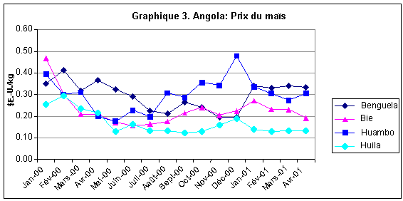 La situation générale des disponibilités alimentaires devrait s'améliorer au cours de la campagne de commercialisation 2001/02 (avril/mars), en raison de l'amélioration de la production vivrière. Les prix du maïs sont stables ou baissent avec l'arrivée des nouvelles cultures sur le marché. Cependant, la perturbation des activités commerciales a donné lieu à des écarts de prix importants d'un marché à l'autre. Malgré la meilleure production de cette année et la réduction du nombre de personnes déplacées nécessitant une assistance, 1,34 million de personnes déplacées auront encore besoin d'une aide alimentaire d'urgence en 2001/02. Alors que la situation alimentaire de ces populations demeure extrêmement grave, les distributions d'aide alimentaire sont entravées par l'insécurité et le mauvais état des routes.