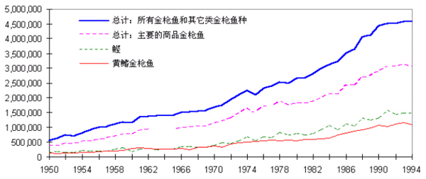 È«Çò½ðǹÓãµÄÖ÷ÒªÉÏÊÐÓãÖֵIJ¶ÀÌÁ¿Ò»Ö±ÔÚÔö¼Ó£¬´Ó20ÊÀ¼Í50Äê´ú³õµÄ50Íò¶Ö·¢Õ¹ÖÁ1994ÄêµÄ310Íò¶Ö£¨¼ûͼC1.6£©¡£¸ù¾ÝÁ¸Å©×éÖ¯£¨FAO£©ÕÆÎÕµÄ×ÊÁÏ£¬1984¡«1994ÄêµÄ10ÄêÖУ¬²¶ÀÌÁ¿Ìá¸ßÁË44%¡£´ÓÀúÊ·ÉÏ¿´£¬Êг¡ÉÏÖ÷ÒªµÄ½ðǹÓã¾ø´ó²¿·ÖÀ´×Ô̫ƽÑó£¨Ä¿Ç°Ô¼Õ¼64%£©¡£Õ¼µÚ¶þλµÄ£¬80Äê´úÖÐÆÚÒÔǰÊÇ´óÎ÷Ñó£¬ÔÚÄÇÒÔºóÓ¡¶ÈÑóÉýÖÁµÚ¶þλ£¬Ä¿Ç°Õ¼È«Çò½ðǹÓã²úÁ¿µÄ20%×óÓÒ¡£Ö®ËùÒÔ·¢ÉúÕâÑùµÄ±ä»¯£¬ÖÁÉÙ²¿·ÖÔÒòÊÇÓÉÓÚÓÐЩ·¨¹úµÄºÍÎ÷°àÑÀµÄÎ§ÍøÓæ´¬´Ó´óÎ÷Ñ󿪽øÁËÓ¡¶ÈÑó¡£