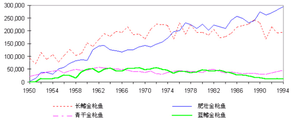 ¹ýÈ¥30Äê¼ä£¬ÊÀ½çµÄ³¤÷¢½ðǹÓãµÄ²úÁ¿ÔÚ20Íò¶ÖµÄˮƽÉÏϲ¨¶¯£¨¼ûͼC1.7£©¡£Ì«Æ½ÑóµÄ²¶ÀÌÁ¿×î´ó£¬Ò²²¨¶¯µÃÊ®·ÖÀ÷º¦¡£¹ýÈ¥10ÄêÖУ¬´óÁ¿µÄС³¤÷¢½ðǹÓãÊÇÔÚ̫ƽÑóÎ÷ÄϺͶ«±±²¿µÄ¹«º£ÉÏÓÃÁ÷Íø²¶Óã·¨²¶»ñµÄ¡£Í£Ö¹´ËÖÖ²¶ÀÌ×÷ÒµÒÔºó£¬Ì«Æ½ÑóÉϳ¤÷¢½ðǹÓãµÄ×ܲ¶ÀÌÁ¿¾ÍϽµÁË¡£
