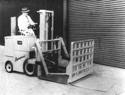 ACCESORIO MONTACARGAS «SKID STAC». - Placa portacargas y bastidor de tracción y empuje, provisto de hoja inferior de agarre, accionado por el sistema hidráulico del montacargas. El bastidor de empuje está montado sobre barras telescópicas deslizantes a ambos lados. Los movimientos de tracción y empuje, y los de agarre, se suceden automáticamente por medio de una válvula que permite que la hoja inicie el agarre antes de que el bastidor se retire, y la apertura, antes de que éste avance. Se fabrica en tres modelos: