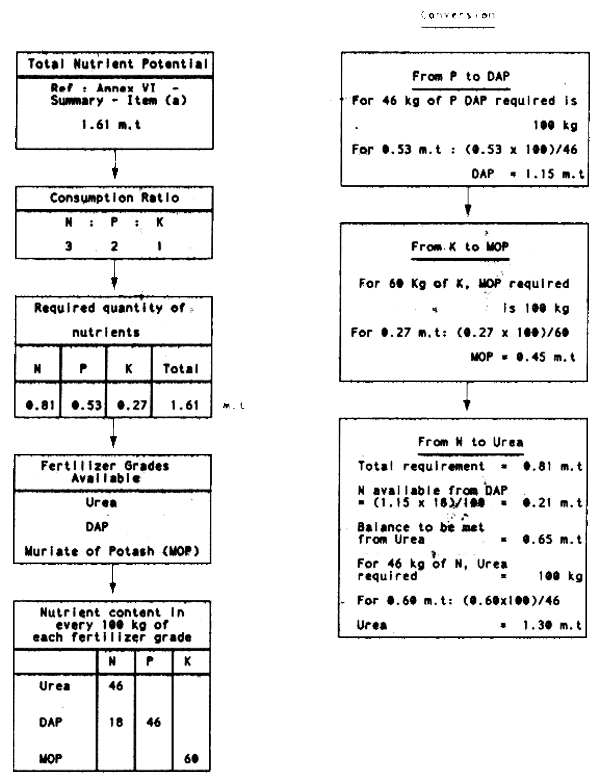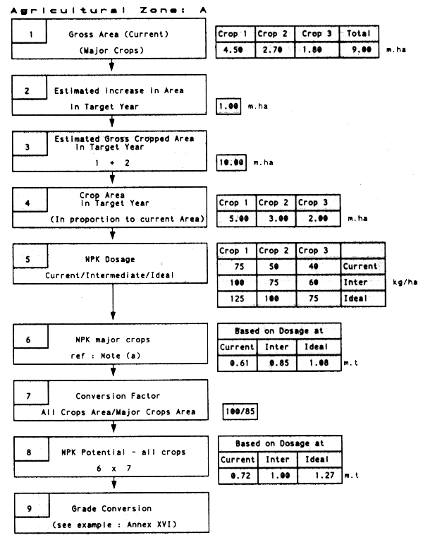Area x Dosage repeated for each crop and totalled. Same procedure is repeated for 3 different dosage levels, i.e., current, intermediary and ideal.