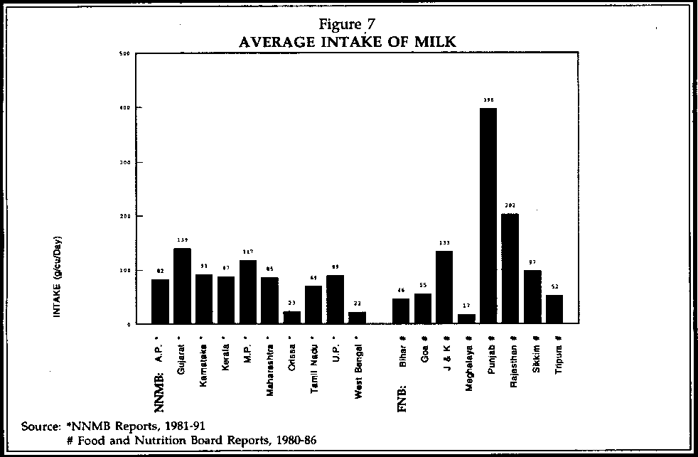 The RDI for milk/milk products is 150 gms/cu/day. We find that only Punjab (very high at 396 gm/cu/day) and Karnataka (282 am) exceed it. Milk consumption is not only a function of purchasing power but also of local availability (because it cannot be easily transported to all places and over long distances) and consumption behaviour. In tune with its poverty, the milk intake in Orissa is one of the lowest, only West Bengal and Meghalaya (more consumption of tea than milk?) being lower than Orissa.