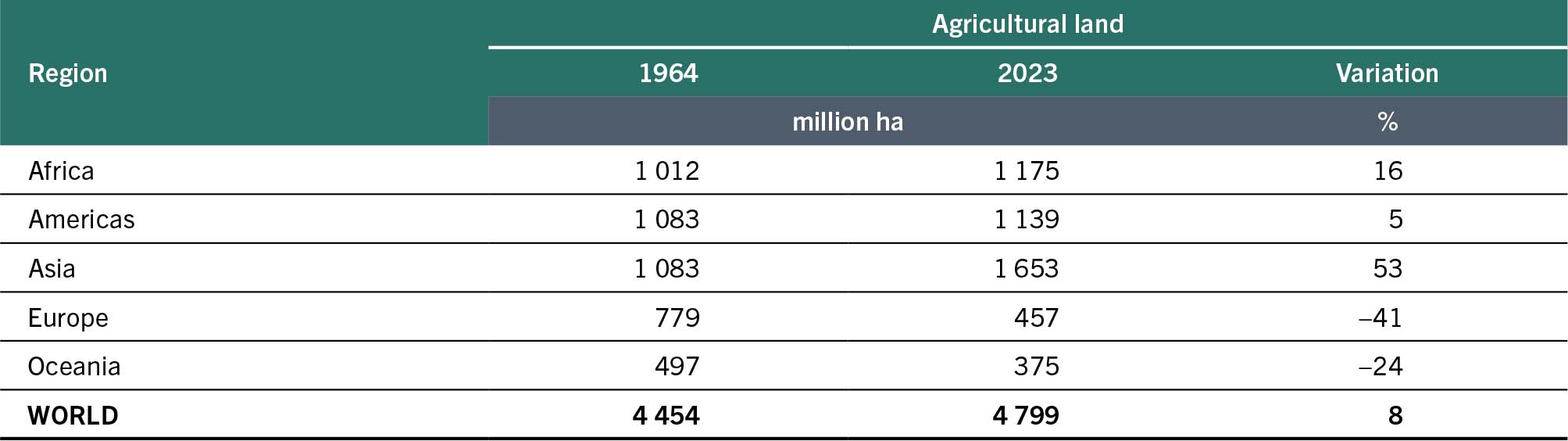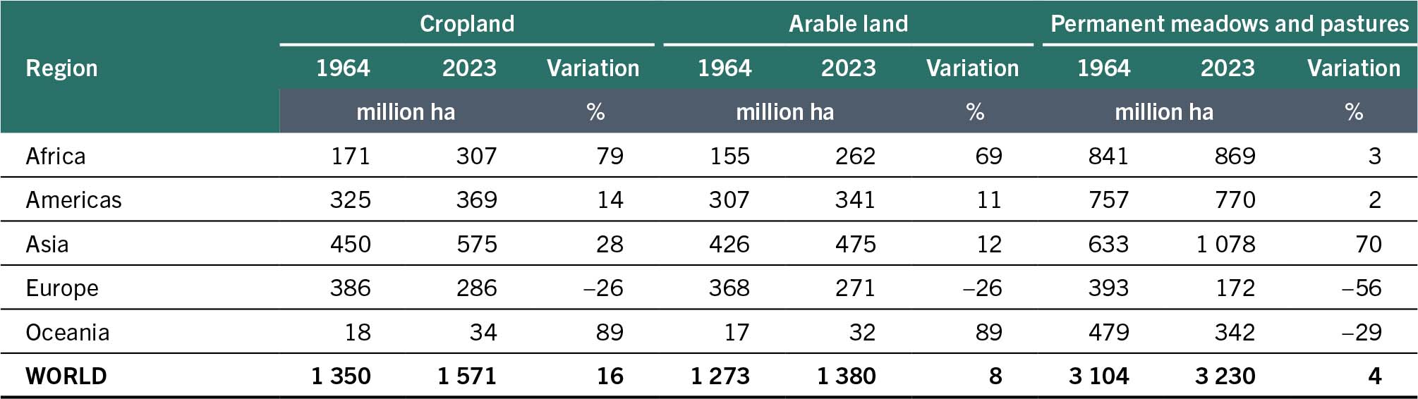 Data on cropping intensities per crop are not available at country level. Based on Table 2, and assuming the same cropping intensity for cereals, Table 3 provides an estimate of the change in extent of cereal cropland over the period 1964–2023.