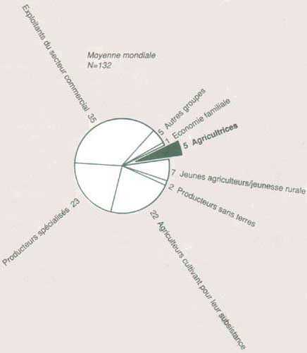 Selon l'étude FAO de 1989, "l'accès des femmes aux cours de formation dans les secteurs agricoles prioritaires est important au Mexique, aux Philippines, en Thaïlande et au Brésil. De plus, les programmes de vulgarisation qui ont fait l'objet d'études au Pérou, en Colombie, en Chine, à Chypre, au Cameroun, au Sénégal, au Mali et au Rwanda, comportent tous un taux d'apprenants féminins bien plus élevé que la moyenne".