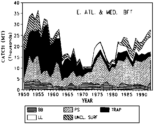 Figure 11. Cumulative bluefin catches (in metric tons) in the east Atlantic (including Mediterranean), by various fishing gears. BB = bartboat, LL = longline, PS = purse seine, UNCL SURF = unclassified surface gear.