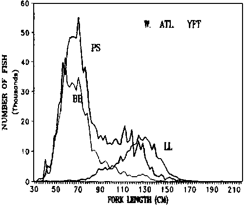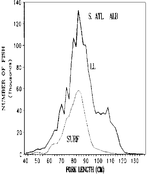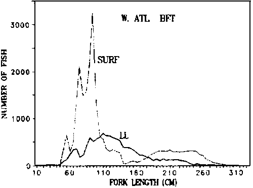 On the other hand, fishing by various surface gears for the same age groups also occurs almost in the same area and at the same time (e.g., troll and baitboat for age 2-4). The situation is further complicated by many of these gears catching tunas other than bluefin (e.g., Spanish trollers catch albacore as the target species; Asian longliners also target bigeye and most of the other tunas and Spanish longliners target swordfish).