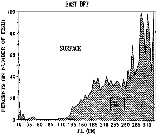 Figure 13. Percentage of longline and surface bluefin catches in each size classe, in the east and west Atlantic, average for 1985-93.