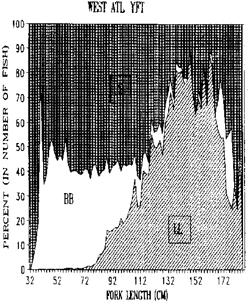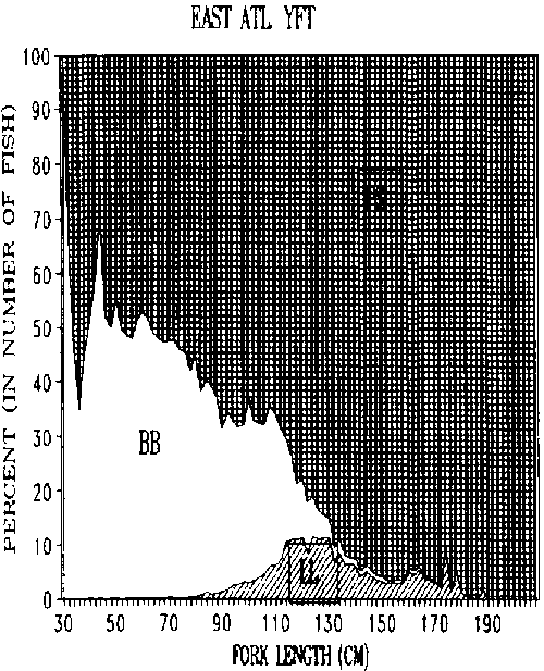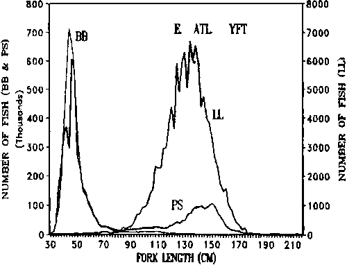 From these figures, as has been already discussed in the previous sections of this report, it can be concluded that the longline gears catch relatively large tunas while the surface gears catch relatively small tunas. Therefore, if there is an interaction between surface and longline gears, it will occur more consecutively than simultaneously. Surface fishing reduces the stock size of juveniles and thus, like the longline fishery, affects the adult spawning stocks. For most of the tunas, the spawner vs. recruit relationship is not yet well established and thus the catches by longline may not affect the young tuna populations exploited by the surface gears. However, if such a relation exists, as has been assumed in the bluefin tuna assessments, the possible interactions of these two types of gears are mutual.