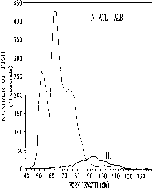 The northern stock is harvested by surface gears and longline, while the catch by the latter has been much less important. The fishing area does not overlap significantly between these two types of gears due to the fact that the surface gears catch mostly young fish while the longline catches spawning stock (or mature fish). The surface gears consist of troll (Spain and France), baitboat (Spain, France), drift gillnet (France, Ireland and the UK) and mid-water trawl (France), and the areas of their operations are almost identical. In recent years, there has been significant conflict between the countries using drift gillnets and those which prohibit the use of this gear, since it seems that the drift gillnet is a more efficient fishing method (see Section 3.3 for explanation). Yield-per-recruit studies suggest that some increase in yield could be expected if the size of the first capture is increased.