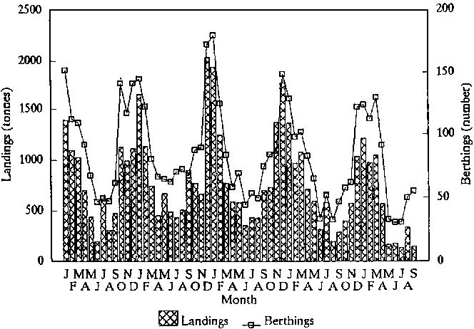 Figure 1 also shows the number of berthings recorded by the Penang Port Commission. The highest number of berthings were recorded also during the months of December of one year and January of the following year. There is a close correlation between the number of berthings and the quantity of tuna landed.