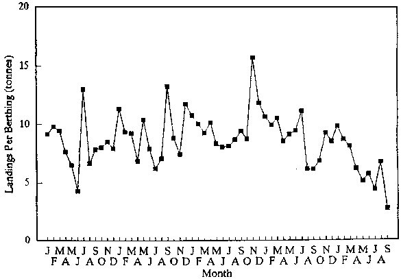 Figure 4. Landings per berthing recorded at Penang Harbour, 1990-94 (data from Penang Port Commission).