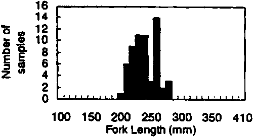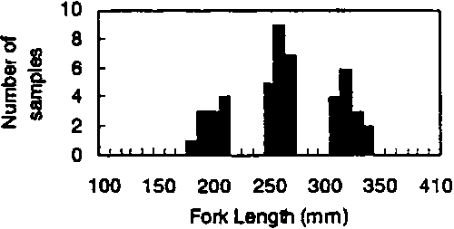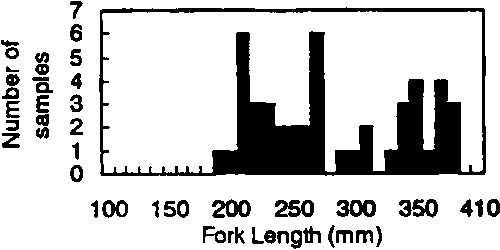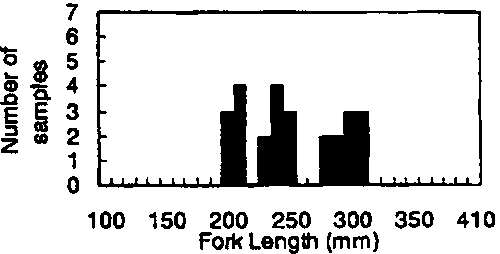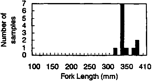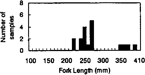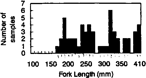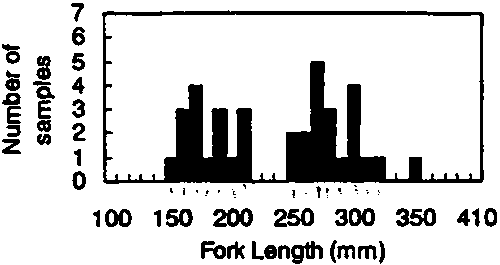 The sampling scheme was to collect yellowfin and bigeye tunas of 150-350 mm FL, randomly selecting five fish in every 50 mm length interval, at each sampling site and time. Accordingly, the total number of fish sampled would be 320 fishes for each sampling. In this way, it was expected that there would be enough fish to estimate the ratio of species misidentifications by samplers, if it existed. In addition, the sample should be large enough to characterise any changes in morphological characters by size and by season.