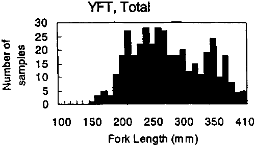 YFT total = 395, BET total = 118, Grand total = 513The length frequency distributions of sampled fish are shown in Figures 2-6, by sampling site and season. Fish smaller than 200 mm FL are relatively scarce. Reflecting the sampling scheme, samples are scattered more or less evenly between 200 and 400 mm. When the desired sampling scheme could not be met due to shortage of tuna catch or absence of required fish size, fish from other length classes were sampled to reach the expected sample number, and in some cases larger-sized fish up to 400 mm were included.