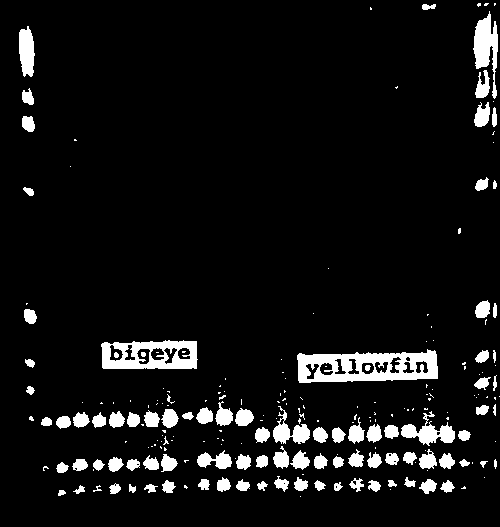 Figure 9. Restriction profile of mitochondrial ATPase gene fragments digested by Rsa I endonuclease, showing clear differences between yellowfin and bigeye tunas.