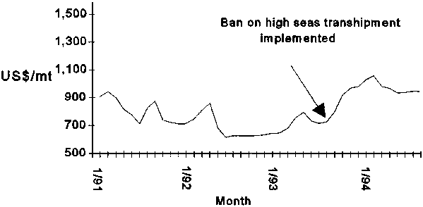 In June 1993 FFA countries restricted those fishing vessels that are licensed to operate in a FFA country from unauthorised at-sea transhipment. One of the reasons for the high seas transhipment ban was the perceived need to alleviate some of the build-up in fishing pressure experienced in the late 1980s and early 1990s. Vessels are now required to steam from the fishing grounds to the designated transhipment port, and then steam back to the grounds, before they can continue fishing. It is estimated that fishing time might have fallen by as much as 20% as a result. Coinciding with the impact of the transhipment ban, there was a marked turnaround in tuna prices, as illustrated in Figure 1. Although there are a multitude of factors influencing tuna prices, it is probable that a significant portion of the price rise was attributable to the transhipment ban.