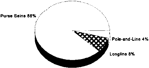 Skipjack tuna accounted for 59% (~102,000 mt) of the 1993 total with yellowfin next at 37% (~64,000 mt). Bigeye tuna harvested primarily by the longline fishery contributed an additional 4% (~7,000 mt) to the total. A small amount of bigeye tuna (~10%) is captured by the purse seine fishery and reported as yellowfin tuna in the catch records.
