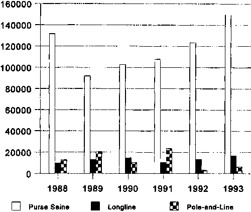 The majority of the FSM tuna catch for 1993, roughly 88%, was taken by foreign and domestic purse seine vessels licensed to operate in the FSM EEZ. The Japanese purse seine fleet, accounted for 89,710 mt or 62% of the total purse seine harvest and 52% of the entire FSM harvest (Table 2). The previous 5-year catch average (1988- 1992) for the Japanese fleet was 87,180 mt.